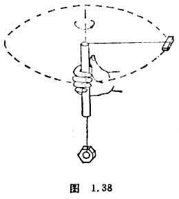 手握空心管,只要使管轴在很小的范围内划圆,就能使橡皮旋转起来,当转速达到一定值时,螺母就会处于静止状态,而不再向下运动(如图1.38)。如果再加大转速,螺母还会向上运动,你能解释这一过程吗?