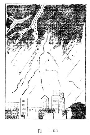 闪电的形状,一般四种:线状闪电,它是由云层伸出终止于空中的一种形如倒挂树枝的闪电(如图1.65)。它并不是一次性放电,而是由多次闪击组成的。每次闪击又由发光微弱的闪电为先导和极为光亮的闪电回击组成。带状闪电,它是由云层与大地之间的线状闪电加上空间强劲的横向大风,使闪电通道变宽,多次闪击迭加而成,宽度可达一二十米。此外还有球状闪电、珠状闪电。