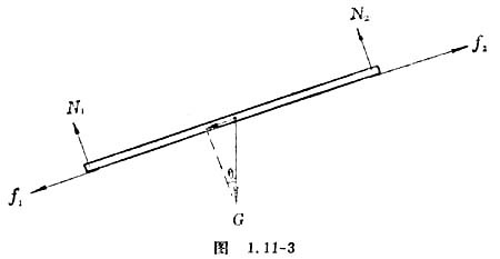 这场比赛能够取胜的关键是只要使自己托木板的这端低于对方,对方托住的那一端就会打滑。为什么高端会打滑呢,我们可以从木板受力分析中找到答案。如图1.11-3,木板受重力G,两端的支持力N1和N2,摩擦力f1和f2。设木板与水平面间的夹角为θ,在未产生滑动以前,木板处于静止状态,沿着木板方向,有如下的关系: