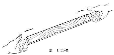 我们将举行一场特殊的比赛。比赛的规则是:由两人各用一只手托住一均匀长木板的一端(不允许用手抓住木板),看谁能把木板拉到自己的一边来(如图1.11-2)。这可是一场斗智的竞赛,你肌肉再发达也不一定能取胜。想一想,再试一试。