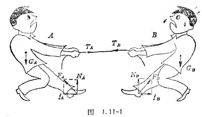 1.相持阶段:比赛开始,双方通过肌肉的紧张作用对地面施向前和向下的蹬力,地面则对它们施以反作用力FA和FB,如图1.11-1所示。FA和FB可以分解为支持力NA、N B和静摩擦万fA、fB。在这个阶段它们处于静止状态,因此有: