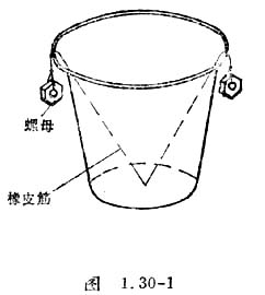 如图1.30-1,把两个金属螺母(M10-12毫米)拴在一根橡皮筋的两端,再把橡皮筋的中点用一短绳固定在冰淇淋纸盒(或铁罐)底部正中,让螺母挂在空盒的口边上。< /SPAN>