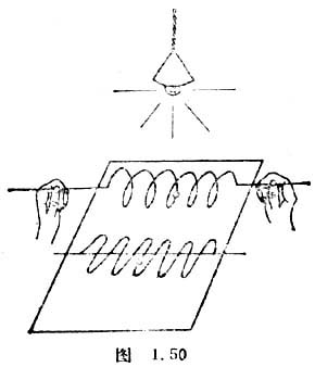 取一根镀锌铁丝(直径2毫米左右),在一只直径约为20-30毫米的玻璃瓶上密绕五、六圈,放松取下以后做成一只螺旋弹簧,如图1.50所示。在弹簧的某一圈上粘一个橡 皮泥或石蜡做的小球。实验时,在吊灯下的桌面上放张白纸,再手持螺旋弹簧放在靠近白纸的上方,在纸面上你就可以看到螺旋弹簧在灯光下的投影。使螺旋弹簧绕自己的轴匀速旋转,纸面上的投影就呈现出波动的形象。仔细观察小橡皮泥球的投影,可以发现,它只是在平衡位置上下振动,而没有向波的传播方向迁移。我们知道螺旋弹簧铁丝上的每一个质点都在做匀速圆周运动,它们的投影都属于简谐运动,而各相邻点之间有一定的相位差,因此各点的投影按一定的规律做有先后次序的振动,整体上就呈现出波动现象。通过现象的观察,你还可以了解横波、波速、波长的概念。