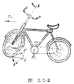 (1)车把偏转时如图2.2-2所示。由于车子有维持v0方向的趋势,地面对前轮的摩擦力 SPAN>f与v0方向相反,f可分解为沿轮面向后的f′和垂直于轮面的f′′。f′是车子沿新 方向前进的阻力,f′′的作用是为车子转弯提供向心力。如果f′′大于最大静摩擦力,车子就要打滑。