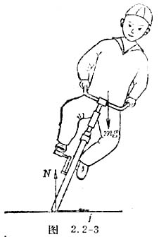(2)车身倾斜后的受力情况如图2.2-3所示。由于车身倾斜,出现了向外打滑的趋势,地面对车子就产生了向内的静摩擦力,它提供车子转弯的向心力。速度越大,转弯半径越小,要求车子提供的向心力越大(F向=m(v2/R)),因此车身需要倾斜得更厉害,但如果超出最大静摩擦力,车子就向外打滑,从而无法维持车子在竖直方向上的平衡状态。
