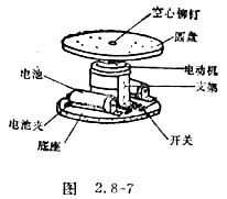 取两块直径约8厘米的圆形胶木板。其中一块作底座,板上竖直固定一只玩具电动机,两侧装上电池;另一块胶木板上钻一小孔,铆上内径为2毫米的空心铆钉,电动机轴穿过铆钉并用焊锡焊牢。两胶木板要求相互平行。按图2.8-7所示,用导线把电池、电动机,开关等连接起来。
