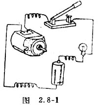 把电池、玩具电动机、小灯泡(2.5伏)和开关用导线串联起来(如图2.8-1)。接通电源,仔细观察小灯泡的亮度有什么变化?再用手捏住电动机的转轴,使转子的转 速减小,看看灯泡的亮度又怎样变化,并解释你看到的现象。