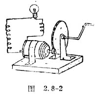 用下落的重物代替手摇来带动转轴,同样可以使灯泡发光(图2.8-3),表明重物的机械能转变成了电能。如果在电路断开时和接通时分别进行实验,你可以发现重物下落的时间在电路接通时变长,即重物下落变慢,这说明下落一定高度,重物获得的动能在这种情况下要小一些,电机输出的电能正是由重物减小的功能转化来的。