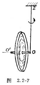 使自行车倒置,把车座(也叫鞍座)和后座(也叫货架或衣架)放在两只板凳上(图2.2-6所示),尽力顺时针转动前轮,使它以较高的角速度旋转,然后使前轮向一侧倾倒。此时你可以看到车把将向倾倒的这一侧发生偏转。如果你能够卸下一个前轮,吊起车轴进行实验,你的感受会更深。按图2.2< SPAN style="FONT-FAMILY: 宋体; mso-ascii-font-family: 'Times New Roman'; mso-hansi-font-family: 'Times New Roman'">-7所示方向旋转车轮,达到比较高的转速后,将车轮释放,你会发现,轮并没有因重力矩的作用而倒下,而是一边自转,一边绕OZ轴逆时针方向旋进。