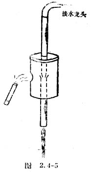 (3)做一个水流抽气机模型。找一支塑料圆珠笔杆,把它截成两段,按图2.4-5所示的结构,把它们装在一只塑料瓶上。在塑料瓶的侧面钻一个小孔。然后通过橡皮接管把这个抽气机的进水管接在自来水龙头上。打开水龙头阀门,并把一支点燃的香烟或蚊香放在小瓶侧面的小孔处,你可以看到高速的水流通过管口。烟被吸入孔中。这 是由于管口的流速很大,压强变小,把附近的气体吸过来与水一起流入下面的管子,这种流体抽气机抽腐蚀性气体时比金属抽气机优越。