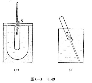 实验时,在保温瓶中装入接近沸腾的水,再把内装温度计的试管(管口用带阀门的管塞封闭)插入保温瓶的水中,试管与保温瓶口之间应装有绝热的塞子,打开试管口的阀门S,待接近热平衡(至少10分钟)后关闭阀门,测出试管内气体的温度t1,如图(一)3.49(a)所示。再把试管取出,倒置于水槽的水中,打开阀门,待试管内的温度接近室温时,使试管内的水面与水槽内的水面相平,如图(一)3.49(b)所示。