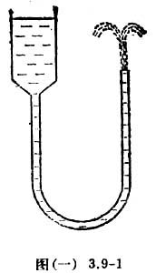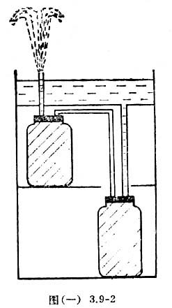 我们常见的一种喷泉模型是应用连通器原理设计的,如图(一)3.9-1,其喷泉的水柱高度不会超过容器中液面的高度。可是我们在一种金鱼缸里见到的喷泉却超过了液面的高度。原来,这种金鱼缸架在一个柜台的上面,打开柜台的门,可以看到里面分为上、下两层,上、下层各有一个容器,并且还看到有几根玻璃管[如图(一)3.9-2],可惜由于容器瓶子是深色的,无法看到内部的结构,请你仔细观察一下这种有趣的喷泉装置,把它的内部结构画出来,并分析这种喷泉的原理。