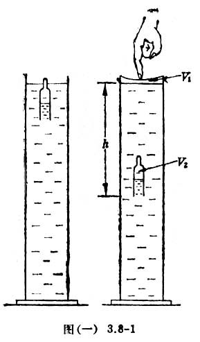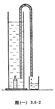 揭开橡皮膜,用一根细的塑料管(或者是作自行车气门芯用的橡皮管)以虹吸的方法把量筒里的水放出,随着液面逐渐下降,观察浮沉子内气体体积的变化和浮沉子的状态,如图(一)3.8-2所示。看到了这些现象以后,请深入地解释浮沉子浮沉的规律。