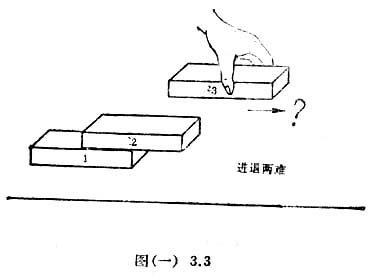 某同学首先把一块砖放在桌上,再把第二块砖放在其上。为了获得尽可能多的伸出面.他使上面一块砖伸出全长的1/2,当放第三块砖时他遇到了难题,见图(一)3.3。第三块砖最多只能与第二块砖对齐,超出一点砖就要塌下来。把第二块砖退缩一点,还是使第三块砖退缩一点呢?退缩多少才是最佳呢?看来还得另想办法。你能把这个巧妙的方法想出来吗?试试看看。