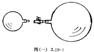 类似的实验还可以用肥皂泡来进行。用一只中间带活塞的三通管,在两侧管下涂少许肥皂液,分别吹气使两侧肥皂泡大小不一一,关闭中间活塞,堵住吹气口。然后,把中间活塞打开,使两个大小肥皂泡连通起来,如图(一)3.19-2所示,看看它们的大小将怎样变化?