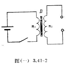 为了帮助你想象它的结构,这里做一点提示:这种感应圈属于一种脉冲变压器,它的原理电路如图(一)3.41-2所示,图中B为升压变压器,n2>>n1,初级绕组的直流电阻很小。当开关接通时,由于电感的作用,初级绕组中的电流逐渐上升,稳定时电流达到最大值,开关断开时,初级绕组电流急剧下降为零。由于线圈中电流的变化,变压器铁芯中的磁通量也发生变化,次级绕组中就会感应出高压,其大致波形如图(一)3.41-3所示。由于断开时的电流变化率比较大,因此感应电动势也比较大,所以能输出有极性的高压脉冲。感应圈中的开关动作不是靠手板动的。输出极性可以通过扳动换向开关来实现,只要你通过仔细的观察和分 析,就能画出它内部的结构。