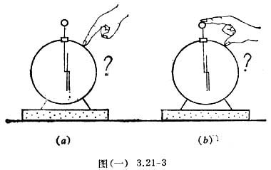 (3)在步骤(2)之后,用手指接触外壳,如图(一)3.21-3(a)所示,验电器指针是否闭合;再用食指和拇指同时接触金属杆和外壳,指针又将如何变化(图b)?