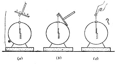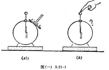 (2)给验电器金属杆带电,指针张开,再用不带电的起电盘(金属盘)同时接触金属杆的小球和外壳,如图(一)3.21-2(b)所示,验电器指针张角如何变化?多次重 复后,再用手指接触验电器金属杆,如图(C)所示,指针是否张开?