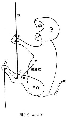 实验时只要把绳的上端固定,在下端用手拉线,使后肢绕O轴逆时针偏转。你可以看到,当后肢伸直到一定程度,绳在A、B轴间打滑,使前肢带着躯干向上移动一段。再使下端的绳松弛,A、B间的绳不再打滑,猴子被悬挂在绳上,其后肢向上弯曲。如此,只要反复用手使下端的绳一紧一松,一紧一松,猴子就向上爬去。