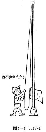 假设旗杆上的定滑轮坏了,从定滑轮处挂下了两根绳子,不能再上下移动,如图(一)3.13-1所示。为了把旗帜升到旗杆顶端,而又不能以爬杆的形式让人把旗帜送上去,你能想出什么巧妙的办法吗?做一做下面的实验,也许能对你有所启发。