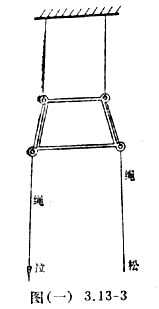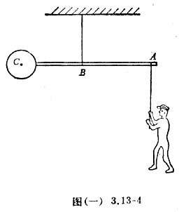 看图(一)3.13-4,你就知道这是一个杠杆。用手向下拉绳,重物就会上升,但是它上升的高度是很有限的。如果能够随着重物C上升,B点的悬挂绳缩短,A点的拉绳放长,就能实现使重物不断上升的目的。但用什么样的装置才能执行这些功能呢?现在提供一只同心的两重滑轮,两滑轮的直径一大、一小,就像轮轴一样,如图(一)3.13-5所示,你能否想出一个方法来完成上述任务吗?