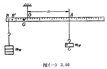 实验时以一只50克的钩码作秤砣,把秤钩挂在B孔的悬线上,逐次增加挂在秤钩上的槽码数,并调节秤砣的位置使秤杆平衡,如图(一)3.46所示。记下每次平衡时重物的质量mW和秤砣挂线点A到提钮O的距离x。