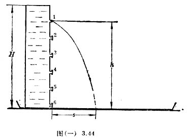 如图(一)3.44所示,取一只较高的塑料瓶(如可乐饮料瓶)在侧壁的母线上钻一排小孔,保持小孔的间距为2.5厘米,在每个小孔中紧插一段圆珠笔芯的塑料管,作为排水管。再剪若干小段软塑料管,将其一头加热软化封闭起来,作为排水管的套帽。另备接水盘,直尺,水杯等。请你利用自制的这个装置做实验,测一下水从哪个位置 的孔中喷出时射程最远?