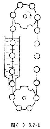 有人设计了如图(一)3.7-1所示的“浮力永动机”。永动机的传动绳上均匀地固定了许多密度小于水的小球,容器底部的管道内径与小球直径相等,并为光滑配合。设计者认为,左边容器里的小球受到浮力的作用向上运动,管道中的小球也将被带着向上运动,一旦这个小球要升出管道,其下的一个小球就会进入管道而不使水漏出,因此永动机将永不休止地顺时针转动。