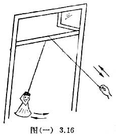 如图(一)3.16所示,利用房间的门框作支架,取一根长线,一端挂一只玩具小人(或者玩具动物)。将线绕过门框上的横梁,手持线的另一端,通过拉线或松线可以使玩具小人离开支轴的距离改变。开始时用另一只手推动一下小人,使其摆动起来。如果你不再有什么动作,小人荡秋千的摆角就会越来越小。现在请设法给小人帮下忙,不过只能用手拉线和松线,以使小人在一定的限度下越荡越高。实验过后请用示意图画出小人重心在一个周期里的轨迹,再解释能够荡高的原因。