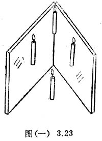 再点燃一只蜡烛,放置在角镜的平分线上,见图(一)3.23。逐步减小角镜的夹角,探索一下角镜成像的数目是怎样变化的?这些像在位置上的分布有什么规律?