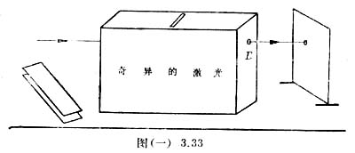 让激光束从黑箱的左侧孔射入,你可以看到它从黑箱的右侧孔射出落在光屏上形成的亮斑,如图(一)3.33所示。在黑箱的顶部有一条槽孔,用以把一些待试探的板条插入箱内。待试探的板条有玻璃板、纸板、胶木板、铝板和铁板。请你把上述板条分别插入箱内,看看氦氖激光对这些板材的穿透本领。把看到的现象记录在表中: