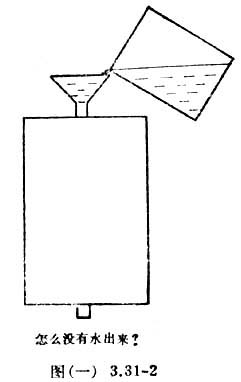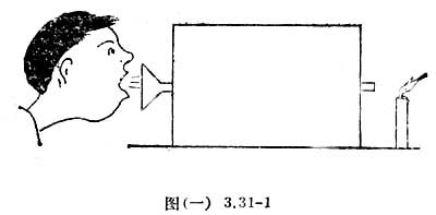 这只黑箱相对的两面各有一只管子,一面的管口接了一只漏斗。用嘴对着漏斗吹气,可以使点燃的蜡烛熄灭,如图(一)3.31-1所示。显然,箱子一侧的漏斗与另一侧的管口是连通的。如果往漏斗里灌水,漏斗里的水很快就灌满了,但水却不会从管口流出,如图(一)3.31-2请充分发挥你的想象力,揭示黑箱里这个通气不通水的怪管的奥秘。
