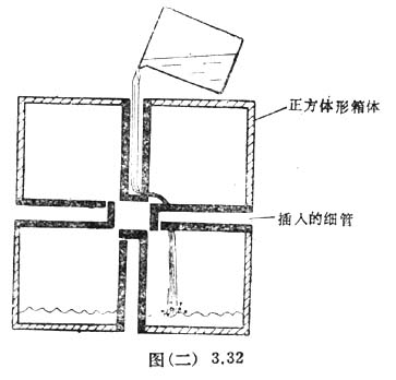 所示(图中所示为上下左右的内插管,前后方向的内插管原理相同)。关键是六杯水灌入后,任何方向上的水平面均不能超过任一管口。