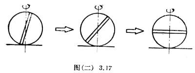 旋转乒乓球时,你会发现,如果使接缝的赤道面一开始处于水平状态,它就会稳定地在这种状态下旋转;如果赤道面处于铅垂状态,它就会边旋转边倾斜,直到赤道面处于水平状态才稳定下来。如图(二)3.17所示。这种现象类似于离心调速器,当转速提高时,调速器的小球有一种离心倾向,即有一种要被抛到离轴最远的趋势。乒乓球接缝处的质量比较大,它的赤道面在水平状态时,接缝部分离开转轴的距离最远。
