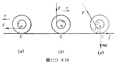 线轴在不同条件下的运动情况如图(二)3.15所示。水平向左拉线时,线轴向左滚动;竖直向上拉线时,线轴向右滚动。由此你可能猜想到,要使线轴不滚动,拉线的方向势必在水平向左和竖直向上的象限内。此时线轴必定受共点力的作用。因为线轴所受的重力、支承面对它的弹力、以及摩擦力都通过线轴与台面的接触点C,所以拉线对线轴的张力也将通过C点。这样拉线的方向很容易就确定下来。若拉线与水平线的夹角为θ,则θ满足下式
