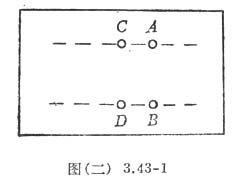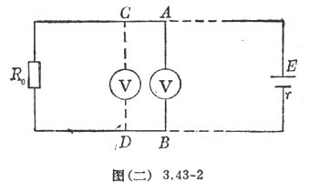 如图(二)3.43-2所示,当电源在右边时,设CD左边的导线的总电阻为R,AC间的电阻为R1,BD间的电阻为R2,根据闭合电路的欧姆定律,不难得出:U0=I(R+R1+R2)