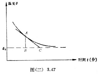实验时根据测得的数据,作出温度0-时间t图象,应如图(二)3.47所示。在图中作θ=θ0的水平线,过图线上菜点 A作切线AC,再作θ=θ0。线的垂线AB。某点温度下降的速率即曲线在该时刻的斜率AB/BC。同样在曲线上取若干个点(4-5个点),作切线,测得相应的AB,BC,AC。
