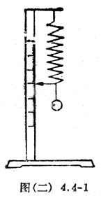 装置如图(二)4.4-1,测出弹簧挂摆球后的伸长X0,然后使弹簧振子在竖直方向上振动,测出振动周期T,根据振子的周期公式: 及胡克定律mg=kX0,可推导出: