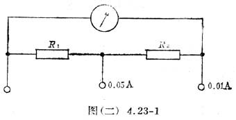 对0.05A量程表,电表等效电阻R′g=Rg+R2,由于Rg>>R2,所以可认为R′g=Rg,分流电阻R=R1。