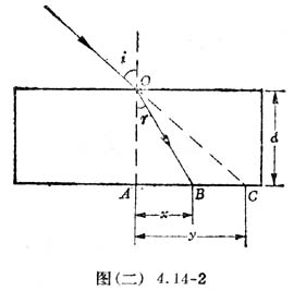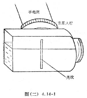 1.在扁平玻璃瓶的一面贴一张带一条直缝的纸(缝宽3-4毫米),而它的对面贴一张描图纸(半透明纸)。在玻璃瓶中装2/3的待测液体,将瓶塞盖好,如图(二)4.14-1放置,用手电筒从有缝的一面垂直入射,记下亮纹在描图纸上的位置,然后让光线斜向入射,在描图纸屏上可以看到两条不在一直线上的亮纹,这是由于下边的亮纹通过液体折射照在屏上而产生了错位。其光路如图(二)4.14-2所示。测出x、y和d,由折射率n=sini/sinr得:
