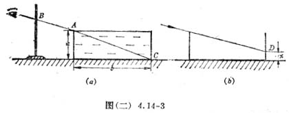 2.如图(二)4.14-3所示,在铝盒中倒满待测液体,从其斜上方观察,调整支架上十字夹B的高度,直到观察BAC在一条直线上。然后把盒中的液体倒掉,仍通过BA方向观察,此时已看不到C点,只看到D点。记下D点的高度x,并测出a、b值,则