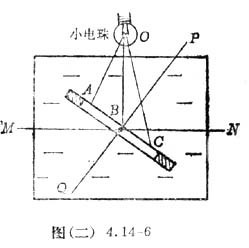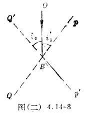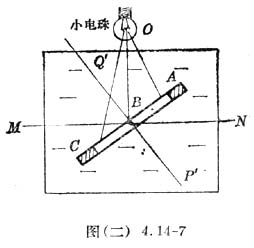 4.在容器中装待测液体,把“空气盒”竖直地插入液体中,再用手电筒作光源从盛液容器的一边向里照射,把立杆放在容器前方。如图(二)4.14-5所示。当空气盒的平面与容器前后面接近平行时,空盒呈现一亮斑,然后向一个方向逐渐旋转空盒平面。当转至一定角度时,圆形的空气盒呈现一半亮而一半暗。为什么会出现这种现象? 看图(二)4.14-6,以小电珠发出的三条光线OA,OB,OC进行讨论。当空气盒偏离MN线旋转一锐角后再继续旋转时,OA,OB,OC光线的入射角是越来越大的。随着旋转角的加大,OC光线首先达到全反射,当∠OBP达到临界角时,OB-OC间的光线都达到全反射,因此在容器前方观察BC间为暗区,而AB间为亮区。记下此时PQ的位置。继续旋转空气盒,暗区逐渐扩大,直至全暗,而后从A点开始出现亮区,逐步向B间扩大。当AB这一半为亮区时,记下P′Q′所在位置,如图(二)4.14-7所示。图(二)4.14-6中的∠OBP和图(二)4.14-7中的∠OBQ′都等于临界角。把图(二)4.14-6和图(二)4.14-7中的两种情况结合起来,画成图(二)4.14-8,可以看出∠PBQ′等于2倍的临界角。测出此角也就知道了临界角,折射率也就不难得出:
