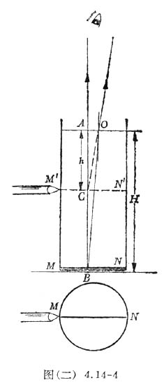 3.在纸上画一条直线,把玻璃杯压在直线上,使直线处于玻璃杯底面的直径上,再往玻璃杯里注入待测液体,至波面接近杯口,从玻璃杯上方向下观察,可以见到直线的折射像上升了一段。将铅笔顺着直线方向沿着杯壁向上移动,直到指向杯底直线的像的位置。测出像离波面的深度h和杯底到液面的深度H,见图(二)4.14-4,