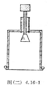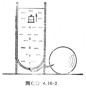 盛水的容器可用装饮料的大塑料瓶制成。将瓶口截去,以使浮沉子能放入其中。在瓶底的中央钻一孔,固定一截圆珠笔芯管作为喷气口。再用细橡皮管(自行车气门芯软管等)的一端连接喷气口,将另一端接在为排球打气的气针上。如图(二)4.16-2所示。