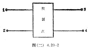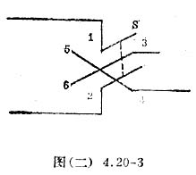 楼梯开关的电路如图(二)4.20-1所示,其基本思路是借助了1、3和2、4两根导线,无论在S1端或S2端,都连通着这两根线中的一根线,因此拨动其中的一个开关,必定可以使两开关接通或断开。如果再要增加一个控制点,可以设想在1、2和3、4导线之间,如图(二)4.20-2所示加一个控制点,要保证S1和S2都能如前一样地进行控制,就必须保证1、3导通,2、4导通;或者1、4导通,2、3导通。要做到这一点,只要在控制点装一个倒顺开关就行了。它可以由一个双刀双掷开关来胜任,电路如图(二)4.20-3,将双刀双掷开关的3、6和4、5端交叉连通起来,当S倒向右侧时1和3、2和4分别导通,当S倒向左侧时,1和4、2和3分别导通。