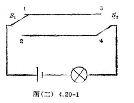整个电路如图(二)4.20-4所示,了解了上述思路,你不难分析,无论在S1、S2或S3处都能控制灯的亮熄。同理,把更多的倒顺开关电路单元接在1、2和3、4点之间,就能实现更多点的控制。