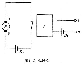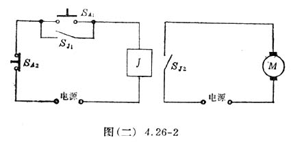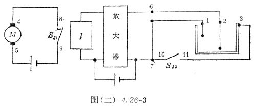 要用继电器来控制水泵工作,带动水泵工作的电动机必须接在继电器的常闭触点所控制的与电源串联的执行电路中,如图(二)4.26-1所示。当水箱里没有水的时候,继电器处于释放状态,常闭触点正好把电路接通,使马达工作,于是水被抽往水箱之中。问题是如何控制水位呢?如果把高低液位探针1、2,接到继电器输入信号的6、7端,一旦水位上升到高液位时,6、7端即被水导通,继电器工作,衔铁吸合,原来的执行电路中的常闭触点也就脱离接触,马达停转;这是我们希望的程序。但在水泵停止工作以后,水位下降,一旦水位与高液位探针脱离接触,因继电器的6、7端之间断开,继电器释放衔铁,常闭触点又接通,马达又开始工作,如此频繁通断,这不符合我们的控制要求。仔细分析上述过程,在液面上升阶段,6、7端断开时,我们需要继电器释放衔铁,常闭触点接通,但在液面下降阶段,6、7端断开时,就 不希望继电器释放衔铁了,如何来维持继电器的工作状态呢?设想有另一个开关,接在6、7两端之间,当水位下降使6、7端断开时,这个开关就接通,那么问题就解决了。这个开关可以从继电器的另一把刀所控制的触点对中来选取(这种能够维持继电器原来吸合状态的电路,电工学中叫自保电路)。例如用手动按钮来控制马达运转时,常用这种电路,如图(二)4.26-2所示。当SA1按触时,继电器工作,SJ2接通,马达工作;同时S1也接通,使继电器能处于稳定的吸合状态。