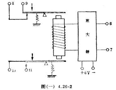 水塔水箱里的水位由继电器来控制,这只继电器的原理结构如图(一)4.26-2所示,它的线圈有放大作用,将6、7两端放入水中而不直接接触,继电器线圈即可导通而使 衔铁动作。继电器的衔铁可以控制两把闸刀,每刀都有常开、常闭触点各一对。