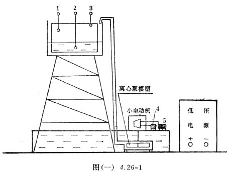 这里有一个水塔模型,如图(一)4.26-1所示,水箱是用透明有机玻璃胶合而成(或用现成的透明塑料盒),箱内插入一块金属板(代表箱体的金属外壳),金属板上装有两根塑料包皮的硬导线,分别作为高、低液位的探针,图中的“1”、“2”、“3”三端分别与高、低液位探针和金属板相通,“4”、“5”是离心式水泵模型电动机的接线端。