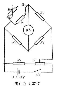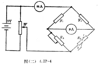 (2)把上述热效电阻接在图(二)4.27-4所示的电桥臂中,图中检流计用50微安的微安表,R3为电阻箱,取R1=R2≈4KΩ,毫安表量程可取5毫安。